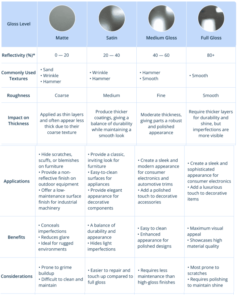 Smooth Textured : Provides the classic clean and sophisticated texture that goes with high-gloss applications.Commonly used for luxury automotive components, decorative furniture, and premium appliances. Smooth textured is more prone to show wear and tear early in the service life than a rough or textured surface, which can help conceal minor scratches and scuffs, maintaining the appearance of the coated product for a longer time