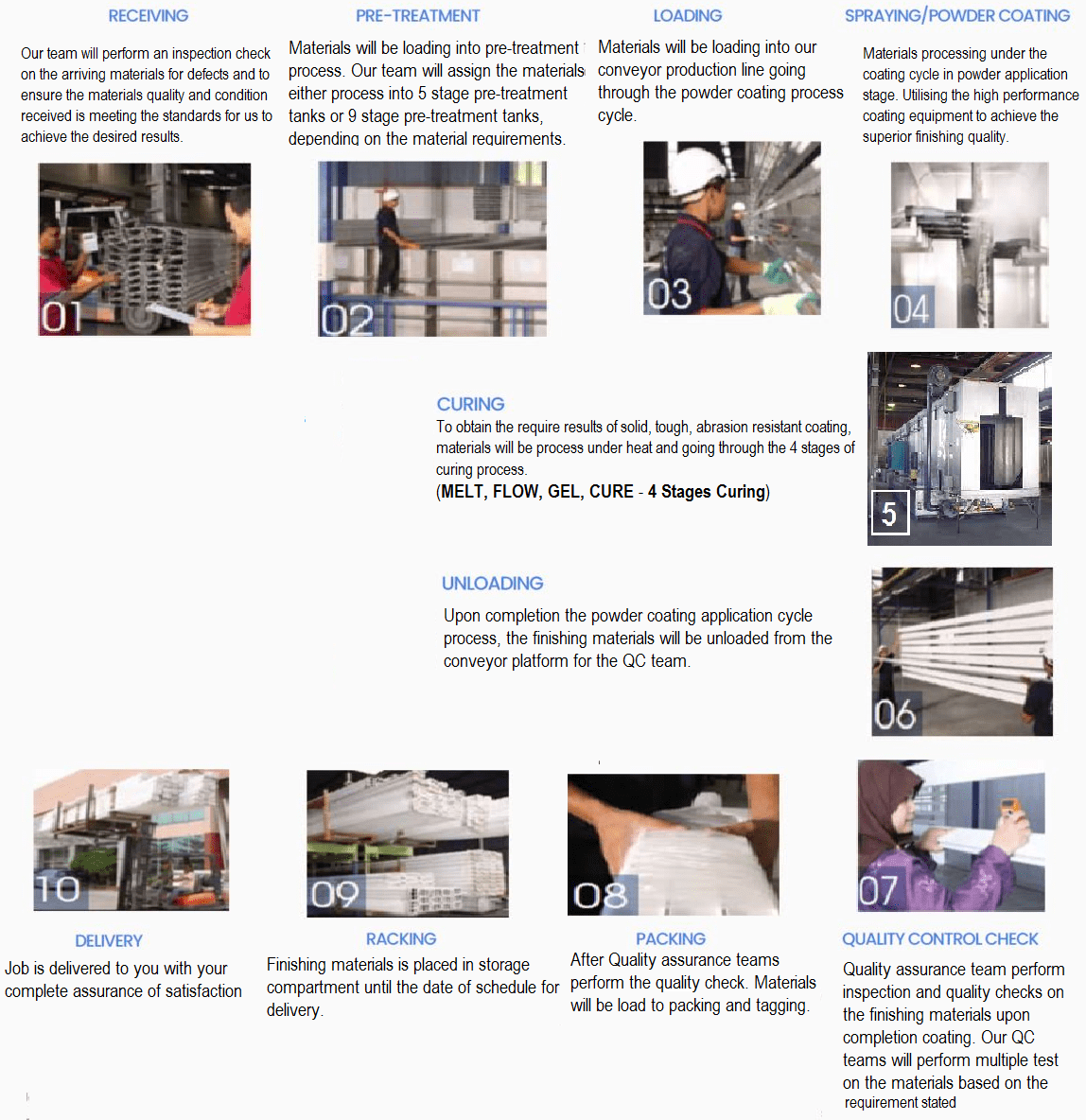 Utilising the high performance coating equipment to achieve the superior quality. Materials in processing by powder coating spraying